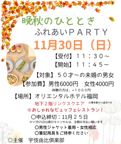 宇伎由比倶楽部主催による40代 50歳以上の方を対象とした 「晩秋のひととき ふれあいパーティー」を開催します。